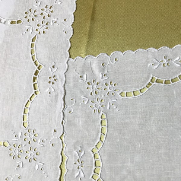 Serie centrini 4pz rettangolare in puro lino Bellora con lavorazione ricamo punto inglese e intaglio Madeira originale a mano.